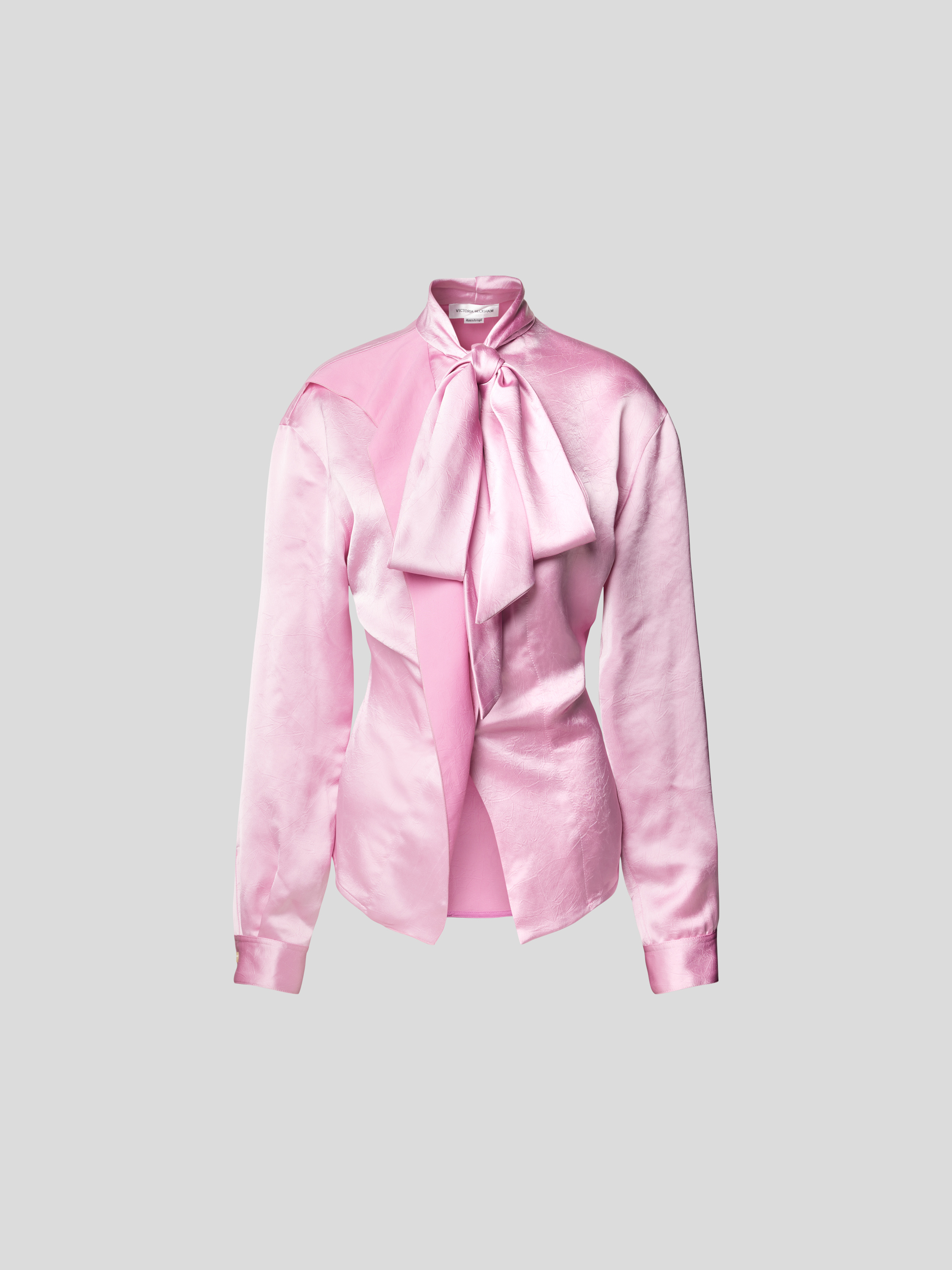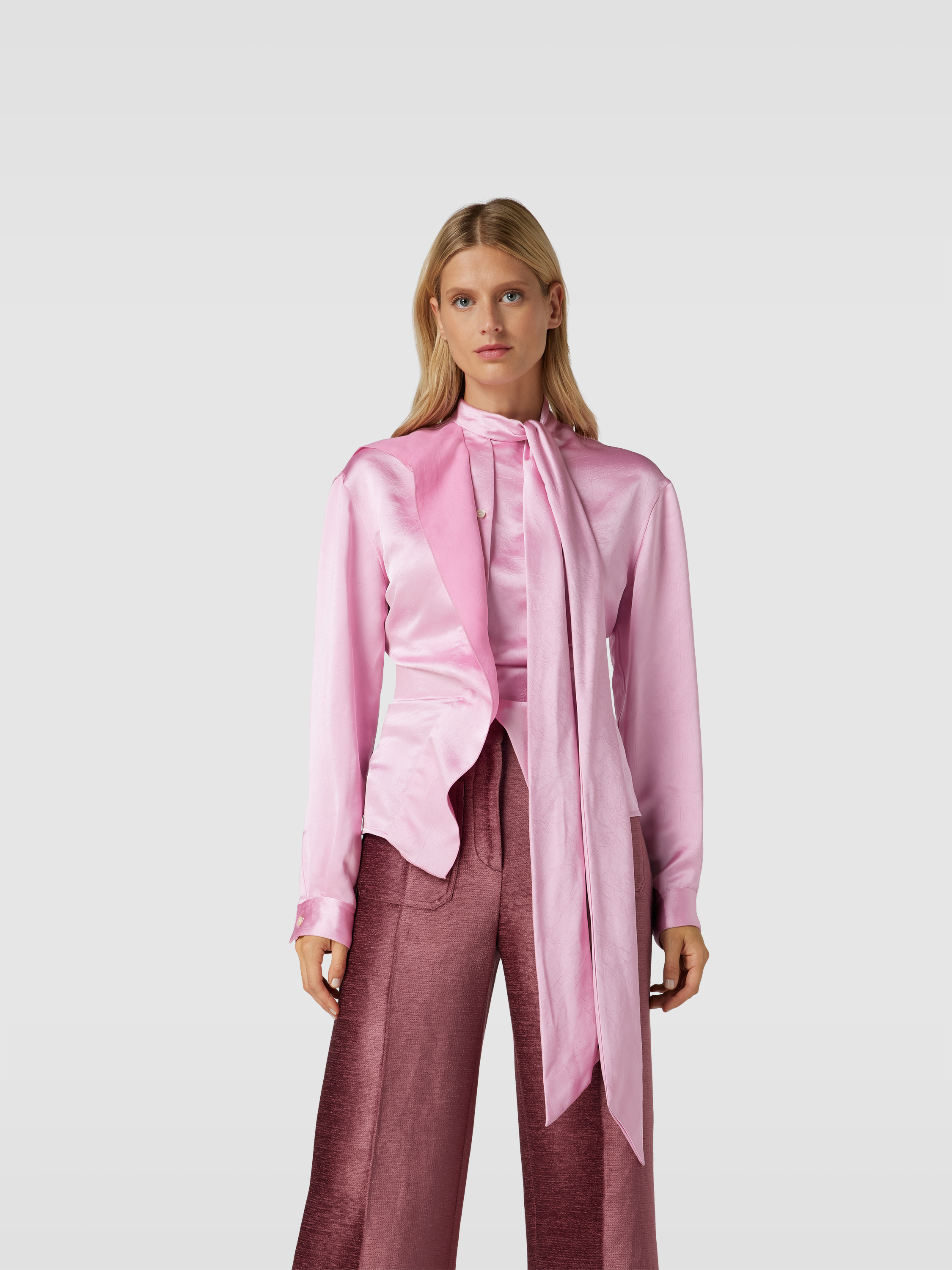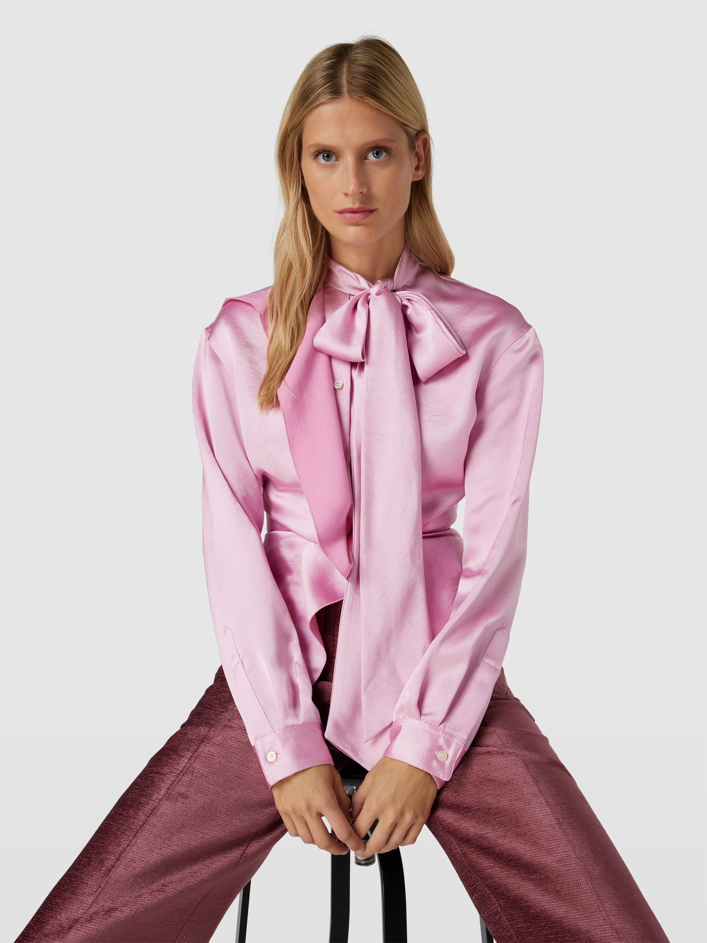 Die Schluppenbluse von Victoria Beckham zeigt sich in fließendem Satin und liegt angenehm am Körper an. Eine Zierschleife am Kragen setzt einen dezenten Akzent, während das unifarbene Design vielseitig kombinierbar bleibt. Durch die langen Ärmel mit Manschetten entsteht ein klassischer Look.